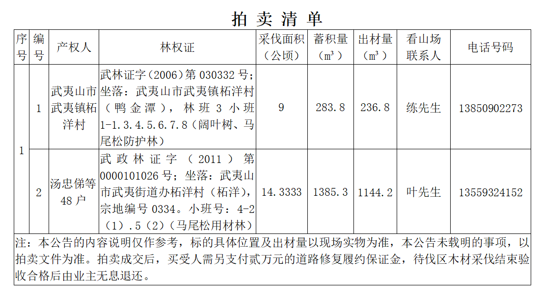 1、拍卖标的:武夷山市武夷镇柘洋村(鸭金潭)林木,采伐面积约9公顷及武夷山市武夷街道办柘洋村(柘洋)林木,采伐面积约14.3333公顷的林木生产销售权(整体拍卖),起拍价为¥27.7万元(具体详见拍卖清单)。