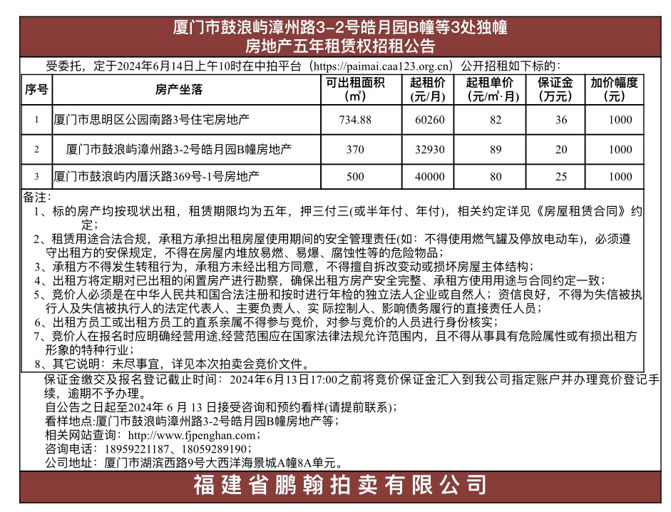 厦门市鼓浪屿漳州路3-2号皓月园B幢等3处独幢房地产五年租赁权招租公告
