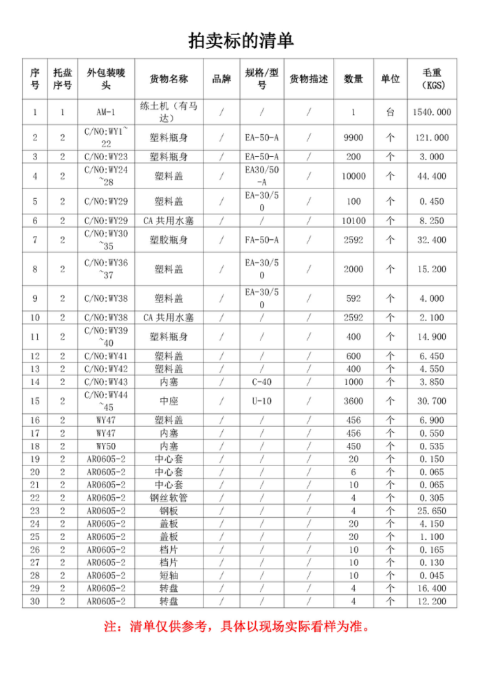 (本次拍卖标的以实际看样为准,有意竞买者请务必在竞买前亲自实地看样并聘请专业人员对标的物进行仔细查勘。委托人及拍卖人对标的质量、数量、重量、品质、真伪等不承担瑕疵担保责任,不负责本次拍卖标的的质量、数量、重量、品质、真伪等问题,标的的质量、数量、重量、品质、真伪等问题由竞买人自行判断确认。标的的产权转移资料及手续均由买受人自行办理。竞买人参拍即视为已对拍品质量、数量、重量、品质、真伪等状况已充分了解,并愿意承担全部责任。)