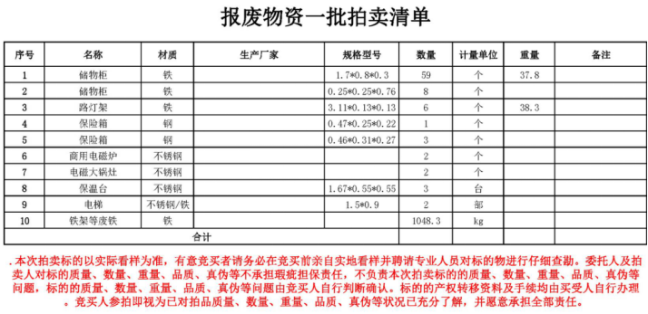 1.本次拍卖标的以实际看样为准,有意竞买者请务必在竞买前亲自实地看样并聘请专业人员对标的物进行仔细查勘。委托人及拍卖人对标的质量、数量、重量、品质、真伪等不承担瑕疵担保责任,不负责本次拍卖标的的质量、数量、重量、品质、真伪等问题,标的的质量、数量、重量、品质、真伪等问题由竞买人自行判断确认。标的的产权转移资料及手续均由买受人自行办理。竞买人参拍即视为已对拍品质量、数量、重量、品质、真伪等状况已充分了解,并愿意承担全部责任。