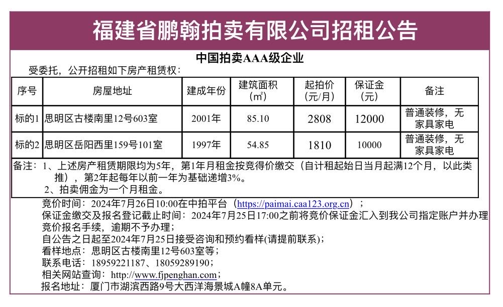 思明区古楼南里12号603室、思明区岳阳西里159号101室2处房产5年租赁权