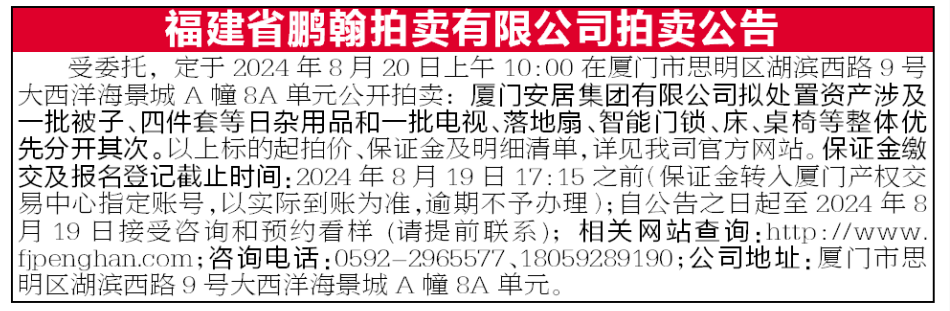 厦门安居集团有限公司拟处置资产涉及一批被子、四件套等日杂用品和一批电视、落地扇、智能门锁、床、桌椅等
