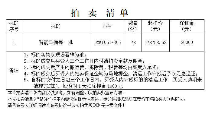 受委托,定于2024年11月19日9:30在中拍平台(http://paimai.caa123.org.cn)公开拍卖:智能马桶等一批 (起拍价178758.62元,保证金2万元);具体拍卖信息及资格条件详见本公司网站或微信公众号。保证金缴交及报名截止时间:2024年11月18日17时;咨询电话:0592-5055607/2277055(即日起可预约看样);报名地址:厦门市思明区湖滨北路108号振业大厦18楼;查询网站:www.xmtp.com.cn