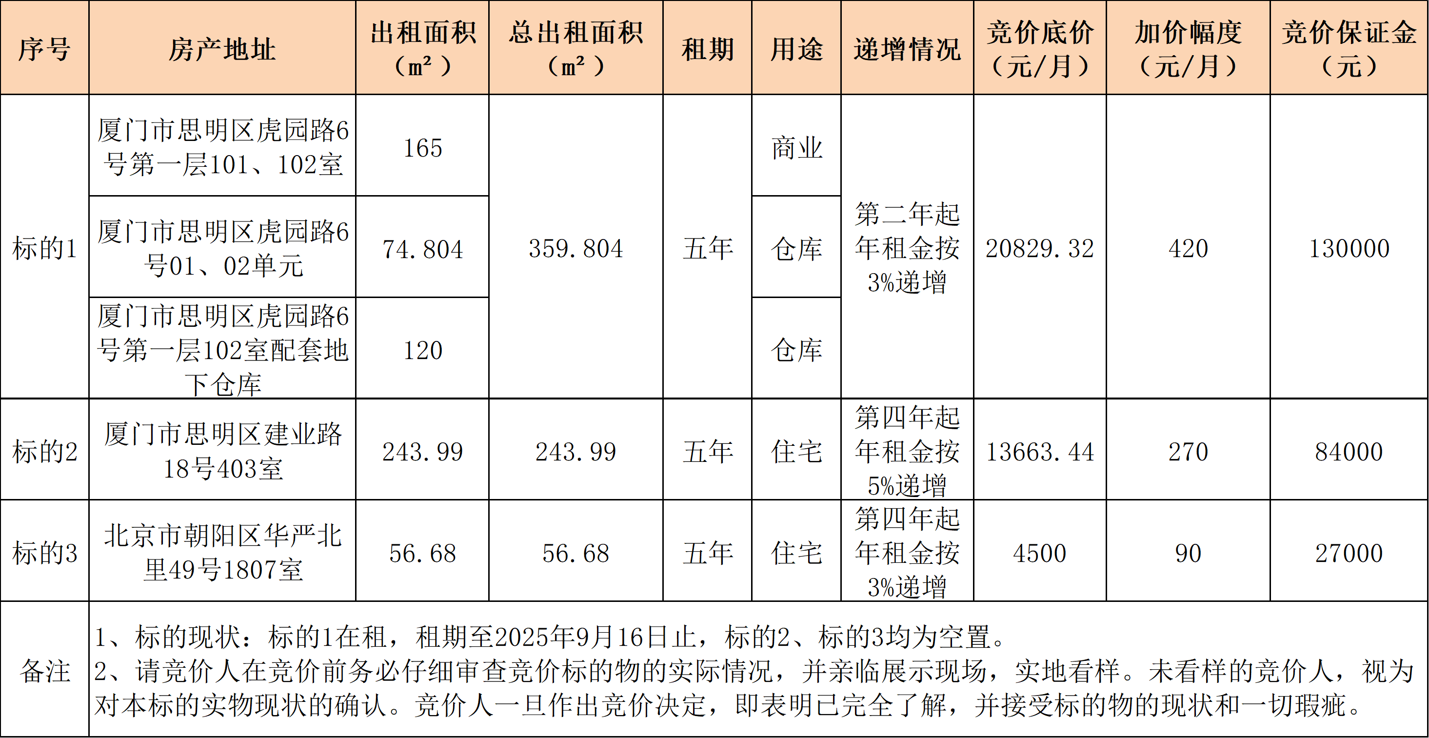受委托,我公司定于2025年9月19日09:30起在厦门市资产资源交易系统(网址:http://120.41.41.16:9101/)采用网络竞价方式公开招租:“厦门市思明区虎园路6号第一层101、102室等5处房产五年租赁权”,招租标的如下: