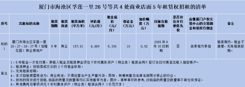 受委托,我司定于2025年9月17日上午10:00在中拍平台(网址:http://paimai.caa123.org.cn)公开举办:“厦门市海沧区孚莲一里26号等共4处商业店面5年租赁权招租”竞租会(具体信息详见平台),报名及保证金缴交截止时间:2025年9月16日下午17:15(即日起预约看样)。竞买人应于报名截止时间前将竞买保证金汇入厦门产权交易中心有限公司指定账户(以实际到账时间为准),并携带相关资料至厦门特拍拍卖有限公司办理竞租手续,报名地点:厦门市思明区湖滨北路108号振业大厦18楼;垂询热线:0592-5055607、13600938287;查询网站:www.xmtp.com.cn(特拍)、http://www.xemas.com.cn/index.html(产权)