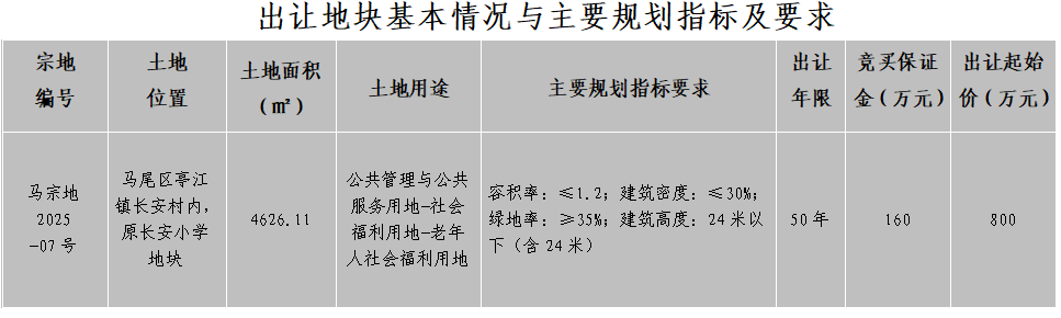 马宗地2025-07号:1.项目地块已具备“三通一平”条件,按现状交地,竞得人若对项目用地水、电等条件有其他需求,由其自行申请并承担相关费用。2.该地块用于新建养老社会福利项目,不得改变用地性质,不得用于民宿等经营性项目及宗教活动场所。
