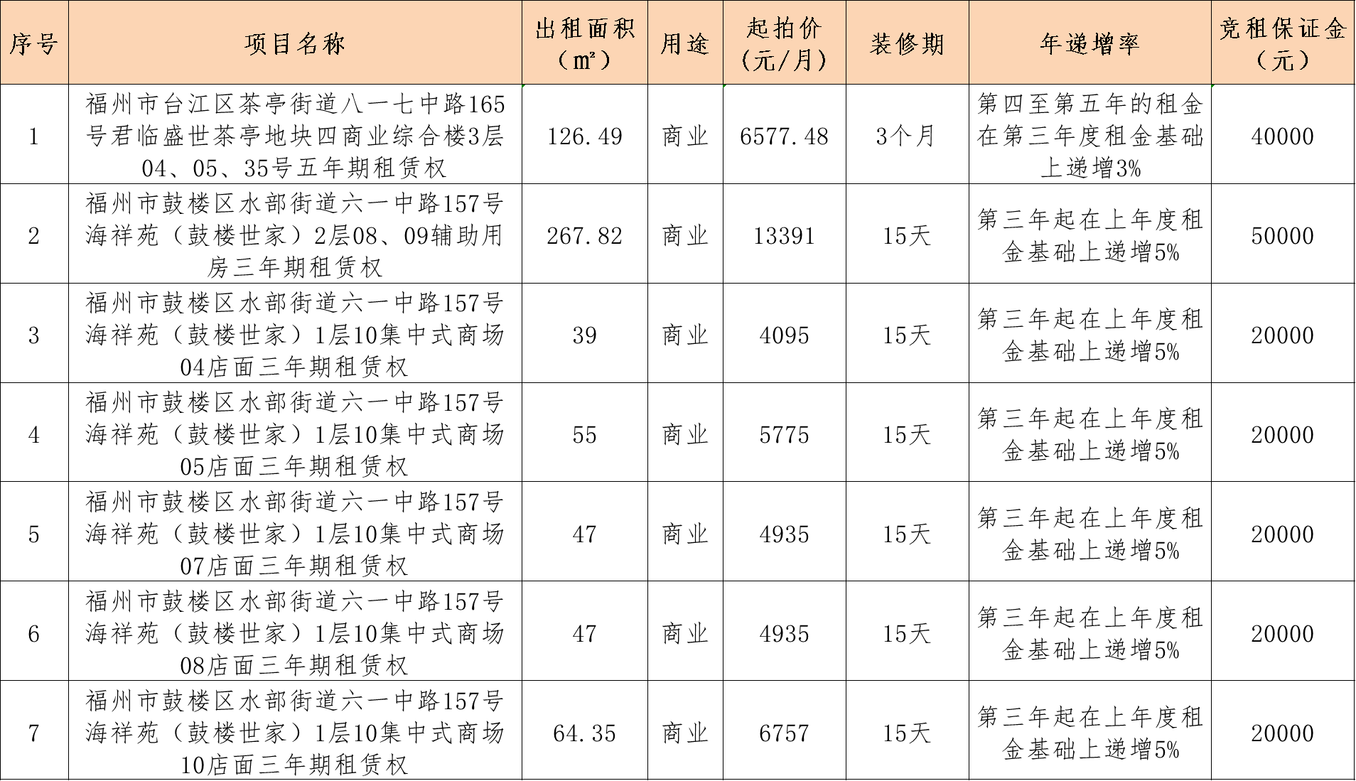 兹定于2025年11月07日上午10时在中拍平台(https://paimai.caa123.org.cn/)公开拍卖:1.福州市台江区茶亭街道八一七中路165号君临盛世茶亭地块四商业综合楼3层04、05、35号店面的五年期租赁权;2.福州市鼓楼区水部街道六一中路157号海祥苑(鼓楼世家)2层08、09辅助用房及1层10集中式商场04、05、07、08、10店面的三年期租赁权,,标的具体信息详见以下清单。