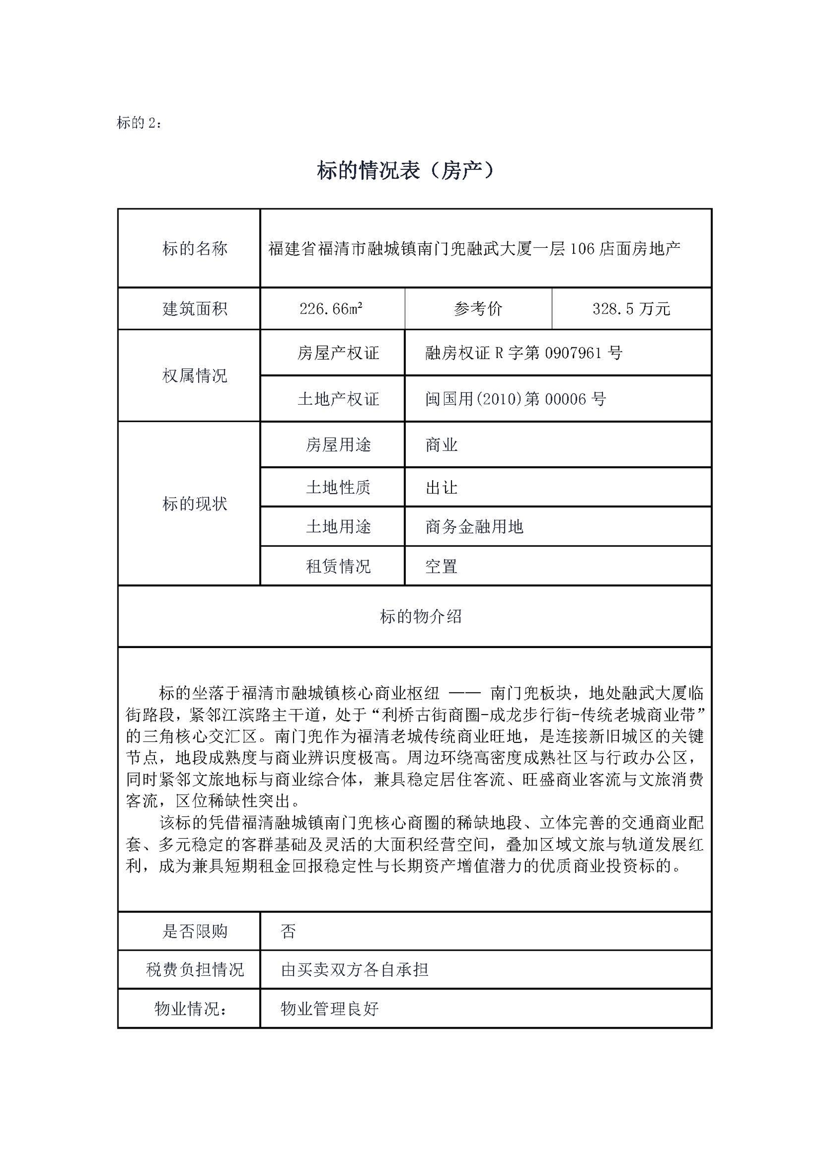2.福州市福清市融城镇南门兜融武大厦106店面房地产(建筑面积约226.66㎡)。