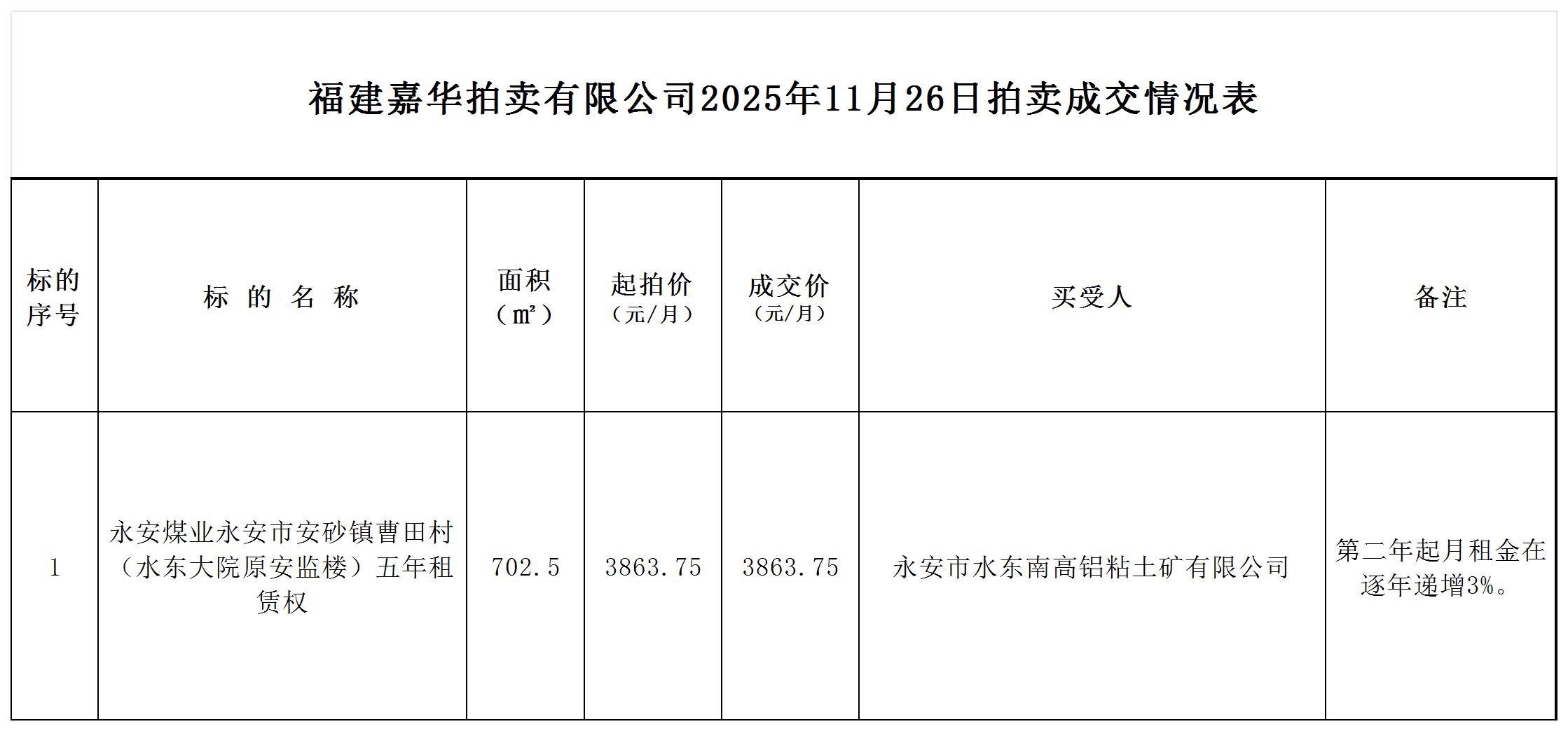福建嘉华拍卖有限公司永安煤业国有经营性资产租赁权拍卖会结果公示