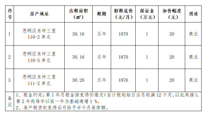 受委托,定于2026年3月12日上午9:30在厦门市资产资源交易平台(http://120.41.41.16:9101/)举办“厦门市思明区东坪三里110-2号单元等三处房产招租”竞价会,具体资格条件详见厦门市公共资源交易网。看样时间:2026年3月9日-11日;报名时间:2026年1月13日9:00-2026年3月11日17:00(保证金须在2026年3月11日16:00前到账),查询网址:http://www.xmzyjy.cn/,www.xmtp.com.cn(特拍),垂询热线:0592-5055607/277055(即日起预约看样)。