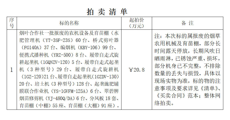 一、拍卖标的:烟叶合作社一批报废的农机设备及育苗棚,详见(拍卖清单)。