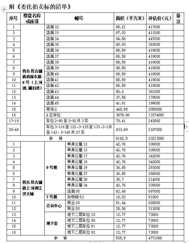 受委托,我司定于2022年6月28日(周二)下午15:30时在将乐县公共资源交易中心交易大厅举行拍卖会,拍品为将乐县古镛镇府前东路8号(上河洲.澜泊湾)项目和上河洲江滨天城9号楼项目中62宗商业店面、单身公寓、杂物间及地下车位的不动产所有权,打包整体拍卖,起拍价2800万元,竞买保证金560万元。拍卖标的产权证办理中,建筑面积、评估值等详见《委托拍卖标的清单》。