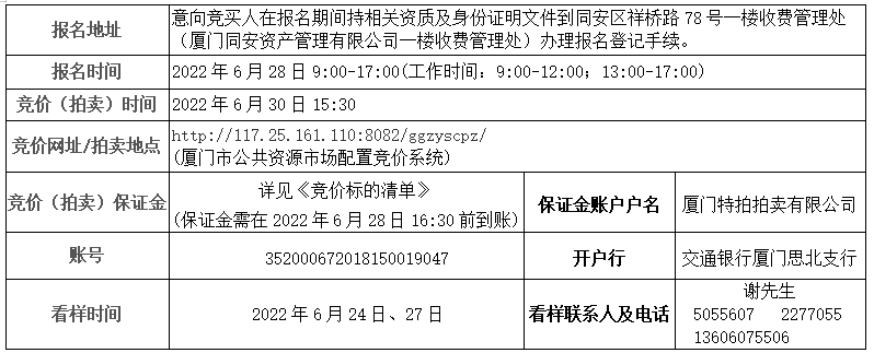 报名及索取详细资料的时间、地点:2022年6月28日(9:00-17:00),同安区祥桥路78号一楼收费管理处(厦门同安资产管理有限公司一楼收费管理处)办理报名登记手续。