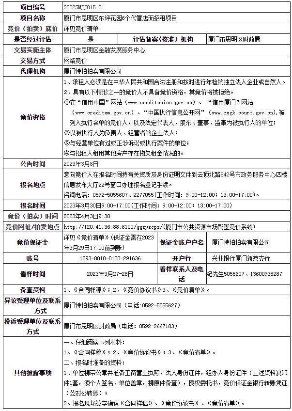 受委托,我司将采用网络竞价方式举办厦门市思明区东坪花园6个代管店面招租项目的竞价会,具体资格条件详见厦门市公共资源交易网,查询网址:http://www.xmzyjy.cn/。