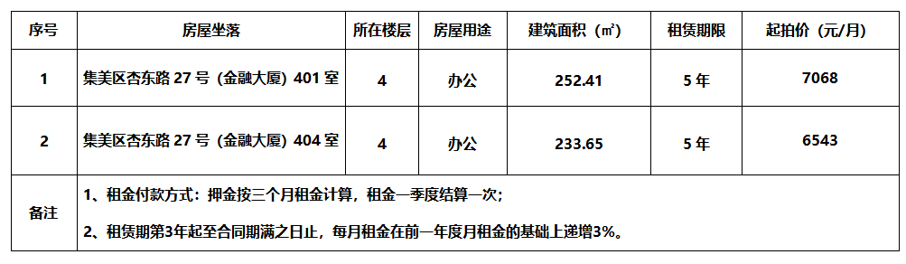 受委托,定于2023年3月31日上午9:30在中拍平台(网址:http://paimai.caa123.org.cn)公开招租:1、厦门市集美区杏东路27号(金融大厦)401室招租(起拍价7068元/月,保证金7万元);2、厦门市集美区杏东路27号(金融大厦)404室招租(起拍价6543元/月,保证金6万元)。