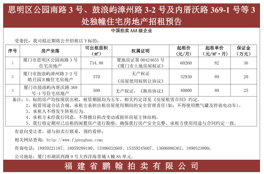 思明区公园南路3号、鼓浪屿漳州路3-2号及内厝沃路369-1号等3处独幢住宅房地产招租预告