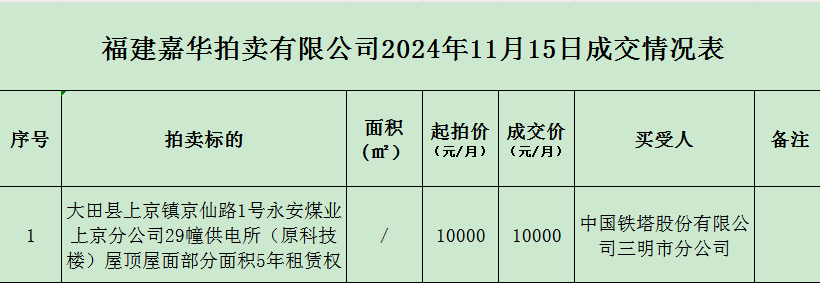 福建嘉华拍卖有限公司永安市煤业经营性资产租赁权拍卖结果公示