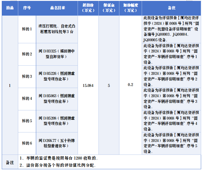 受委托,定于2024年12月27日上午10:00在中拍平台(网址:http://paimai.caa123.org.cn)公开拍卖:闽DB3325福田牌中型自卸货车等5台车辆和液压打桩机等3台机器设备整体转让(起拍价及保证金详见产权交易中心网站转让标的清单);