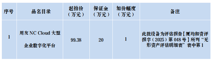 受委托,定于2025年6月12日上午9:30在中拍平台(网址:http://paimai.caa123.org.cn)公开拍卖:用友NC Cloud大型企业数字化平台(起拍价99.38万元,保证金20万元 );报名及保证金截止时间:2025年6月11日下午17点15分止(即日起预约看样);竞买人应于报名截止时间前将竞买保证金汇入厦门产权交易中心有限公司账户(以实际到账时间为准),并携带相关资料至厦门特拍拍卖有限公司办理竞买手续。报名地点:厦门市思明区湖滨北路108号振业大厦18楼;垂询热线:0592-5055607/2277055、13600938287;查询网站:www.xmtp.com.cn(特拍)、http://www.xemas.com.cn/index.html(产权)