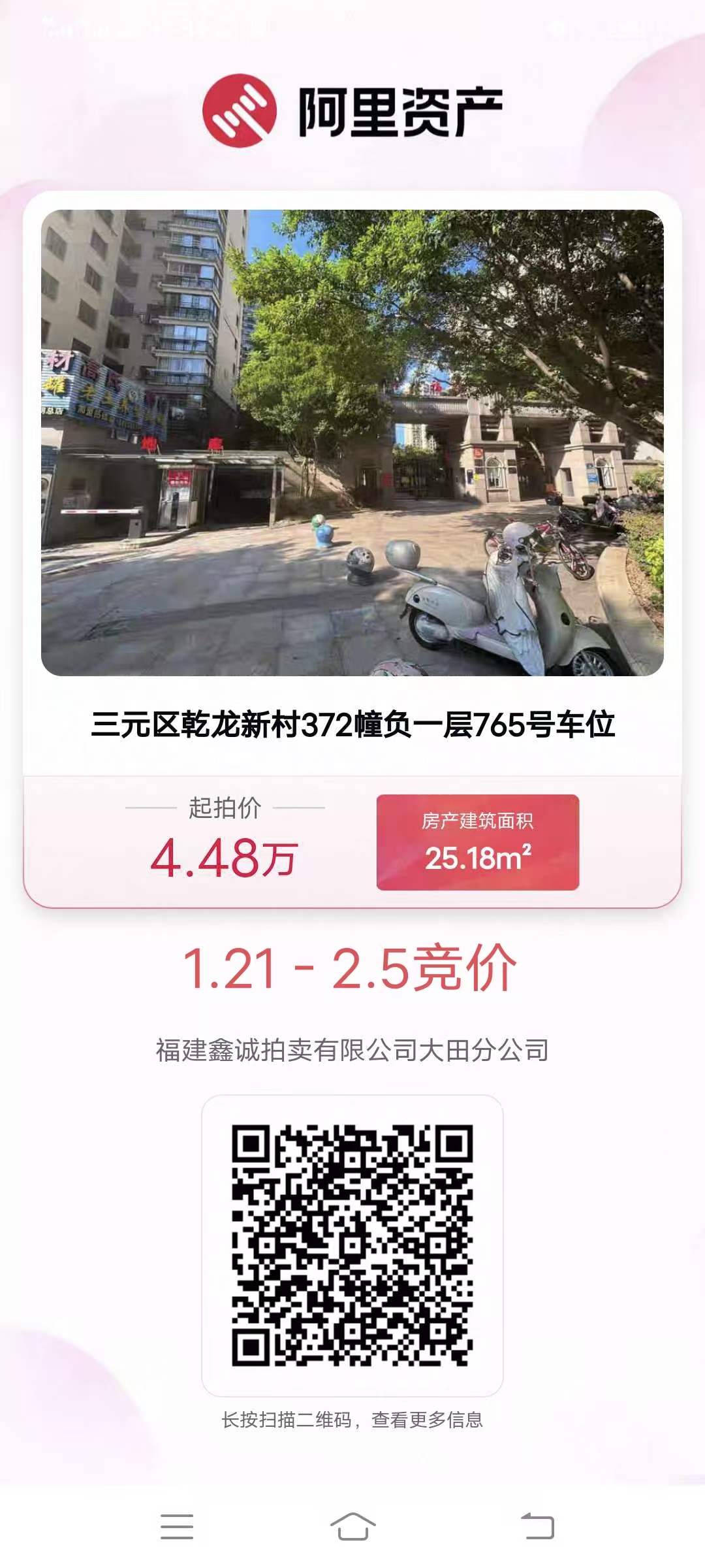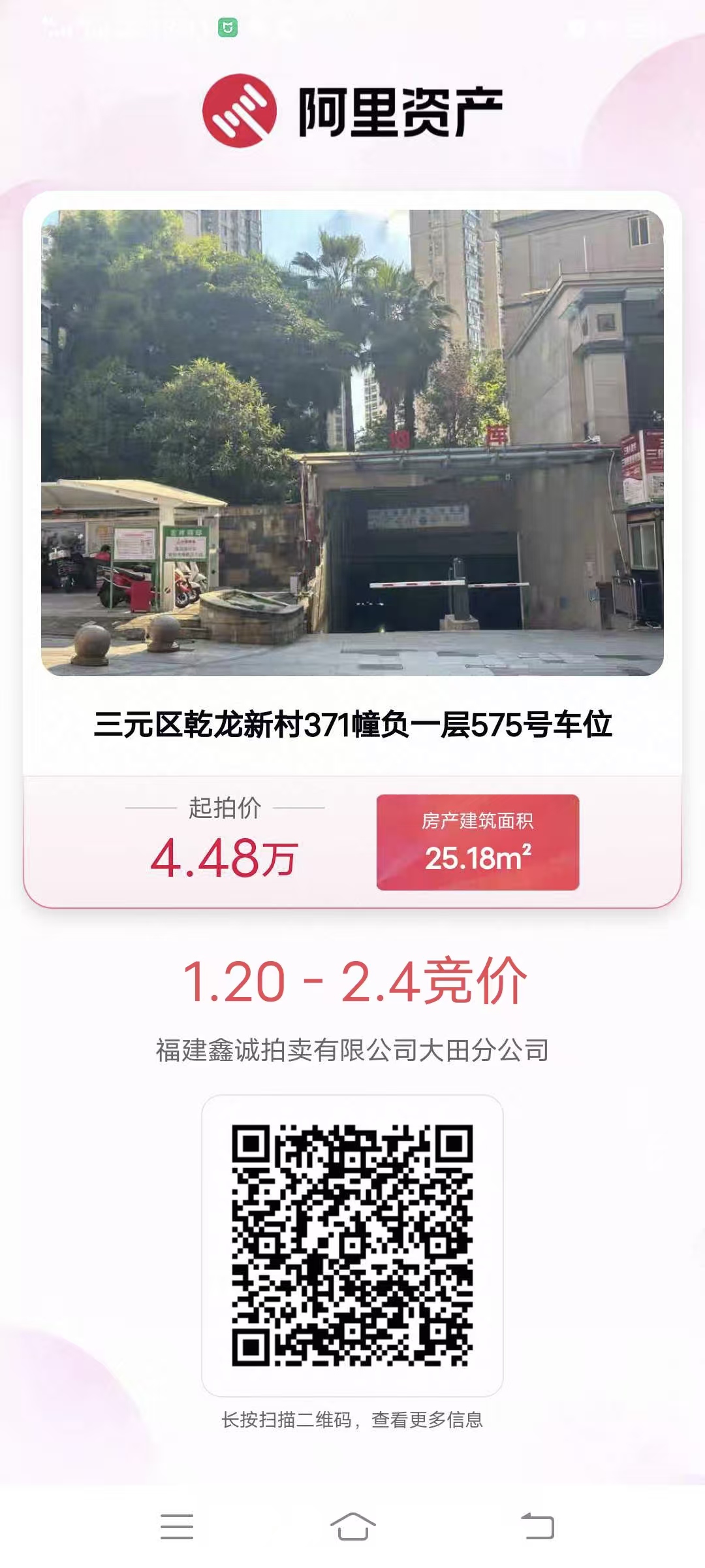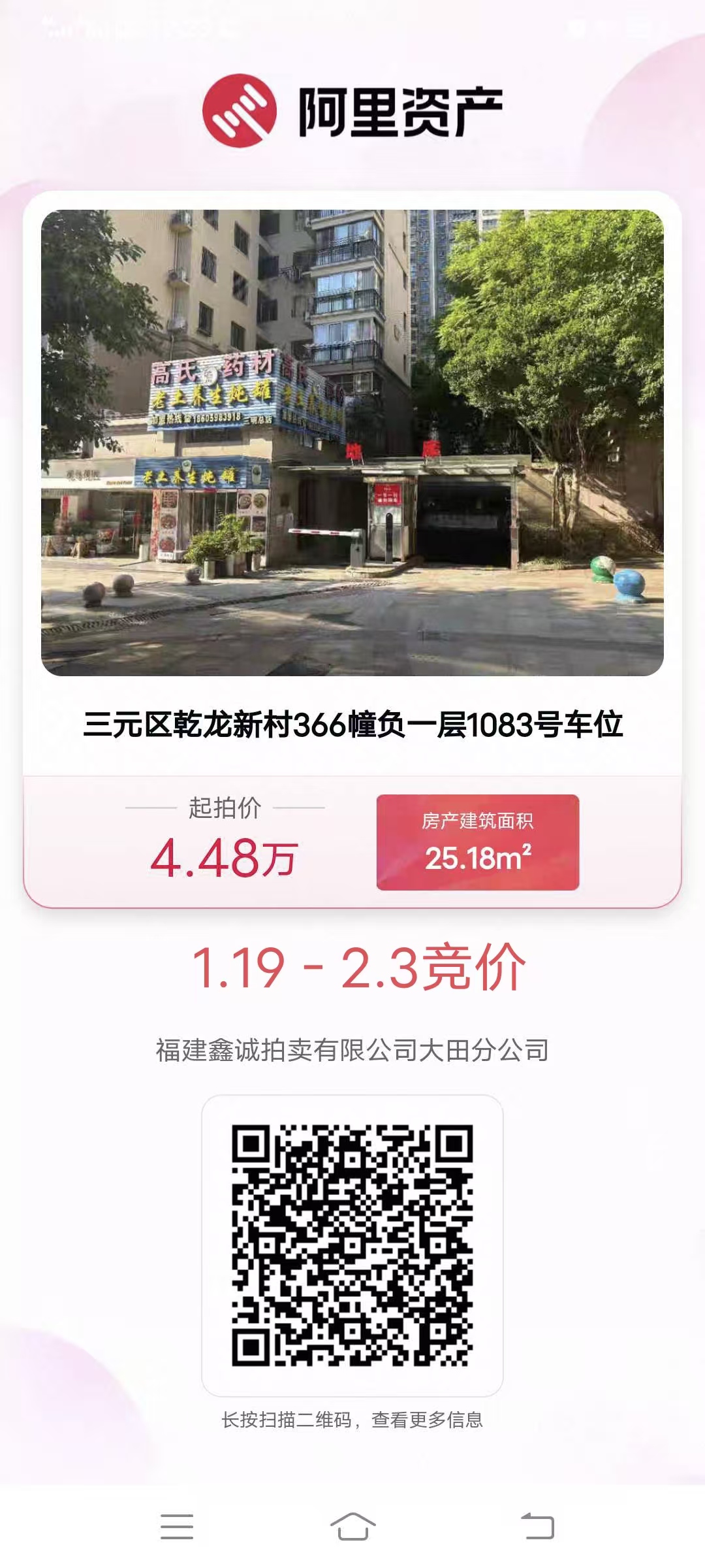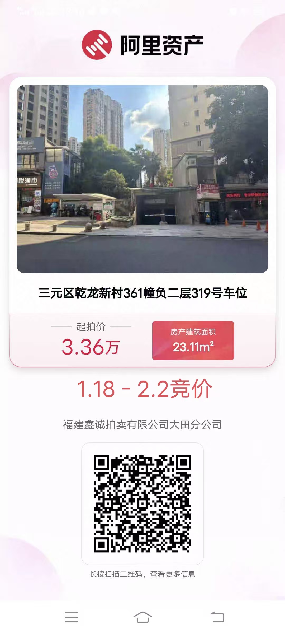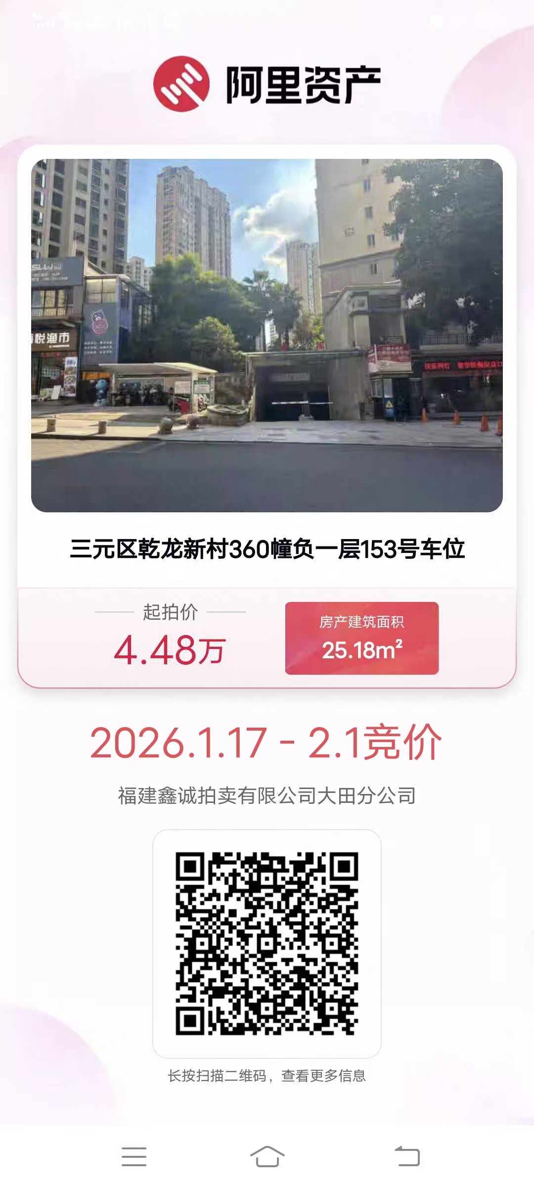 受委托,我司定于2026年01月17日10时起至2026年02月06日10时止在淘宝(中国)软件有限公司阿里拍卖平台对三元区乾龙新村(吉祥福邸小区)车位进行公开竞价,负一层车位起拍价:44800元/个,变卖预缴款:44800元/个;负二层车位起拍价:33600元/个,变卖预缴款:33600元/个;保证金:5600元/个。有意竞买者,可致电或到我司咨询索取详细资料,前往淘宝网注册账户并按时缴纳竞买保证金。联系方式:13306085000(小姜)。注:变卖预缴款在标的页面实际显示为保证金。